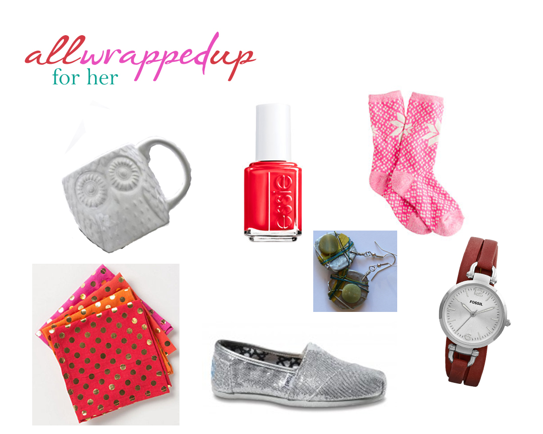| Owl Espresso Cup | Essie Nail Polish | Fair Isle Socks | Foiled Dot Napkins | Green Wire Earrings | Georgia Leather Watch | Glittered Toms |